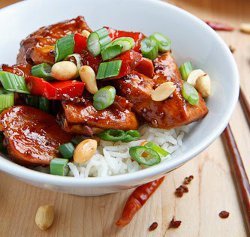 - Add the sauce mixture, bring to a boil, add the chicken, green onions and peanuts, remove from heat and stir in the sesame oil.