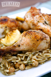This Lemon Chicken with Dill Orzo and Chickpeas recipe from DeLallo Foods is a tasty dish inspired by some of your favorite Mediterranean flavors. Lemon-roasted chicken is served over a bed of orzo and chickpeas with fresh lemon and dill. The perfect weeknight meal!