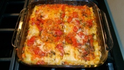 - Coat baking dish with non-stick spray and spread a cup of tomato sauce on the bottom of the dish. Take one lasagna sheet and add a sizable dollop of the veggie/cheese mixture, then roll up into a roll. My dollop was about 1/2 cup, give or take. Place the roll seem-side down in the baking dish on top of the tomato sauce. Repeat until baking dish is full then add remaining tomato sauce on top of rolls.