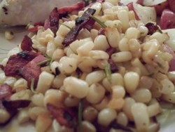 - When the bacon is just about done cooking, add corn. (Colette use sweet corn right off the cob, I used a bag of frozen that was on hand… the fresh was so much sweeter!) Then add a few tablespoons of chopped rosemary (this is the secret, must have ingredient). Stir in another tablespoon of olive oil and a few shakes of sea salt.