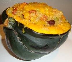 - Stuff each squash halve with quinoa veggie mixture, and sprinkle with one teaspoon cheddar cheese, if using. Cook another five minutes or until the cheese is melted.