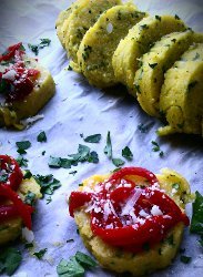 - Slice into 1/4-inch slices and heat a medium sauté pan on medium heat. Add in olive oil and sauté the polenta circles for a few minutes on each side. Remove from heat, top with thinly sliced roasted red peppers and fresh Parmesan. Sprinkle with any remaining fresh parsley.
