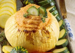 - Spoon mixture into onion shell, sprinkle with nutmeg and bring to room temperature before serving. Serve with 1/4-inch rounds of cucumber, zucchini or yellow squash or 1-inch strips of red, yellow, green pepper or whole grain crackers as dippers.
