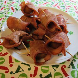 - Now let's wrap those water chestnuts! Take your strips of turkey bacon and cut them in half. Now wrap a slice of turkey bacon around a water chestnut and secure with a toothpick. Keep on going until all your water chestnuts are wrapped.