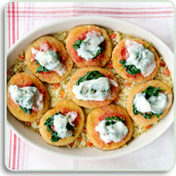 - Assembly: Spread the rice into a heat proof casserole dish large enough to fit 8 chicken patties. Add stock and distribute evenly among the rice mixture. Spread out patties evenly over the rice mixture. Ladle one heaping tablespoon of sauce over each patty. Distribute the spinach on top of the 8 patties. Bake at 350 degrees for 40 minutes. Cut about 4 slices of provolone cheese in thin strips and crisscross over chicken for the last two minutes of baking.
