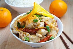 - Heat the remaining oil in the pan, add the dried chilies, garlic, ginger and whites of the green onions and saute until fragrant, about a minute. Add the orange mixture, the chicken and the orange zest and cook until it thickens, a few minutes.