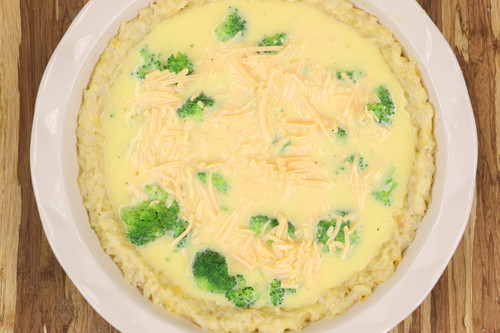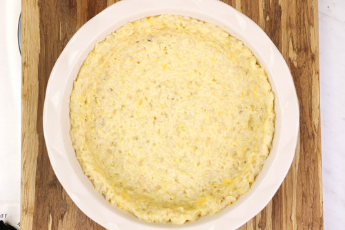 Stir rice, 1/4 cup of the cheddar cheese, Parmesan cheese, and 1 egg together. Press into the bottom and sides of a 9-inch pie pan to 1/4-inch thickness. Bake this crust for about 7 minutes. The crust will just begin to brown.