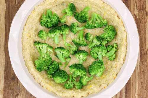 On top of the crust, layer the broccoli, the remaining 1 cup of cheddar cheese, and onions.