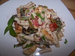 - Mix the pasta, with the roasted vegetables and béchamel sauce then spoon the mixture into a greased 10x10 or 9x12 inch baking dish. Sprinkle with additional grated cheese and paprika then broil for 5 to 7 minutes until the top is golden and bubbly.