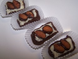 - Dip the almonds into the melted chocolate and apply 2 almonds to each bar. Once all of the candy has its almonds applied you might want to re-cut the lines prior to placing the candy back into the freezer for another hour to harden up again.