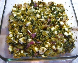 - Blend in 1 quart or larger baking dish: quinoa, chopped spinach, cheese wr Walnuts, and onion/herb mixture with all of the oil used to sauté in.