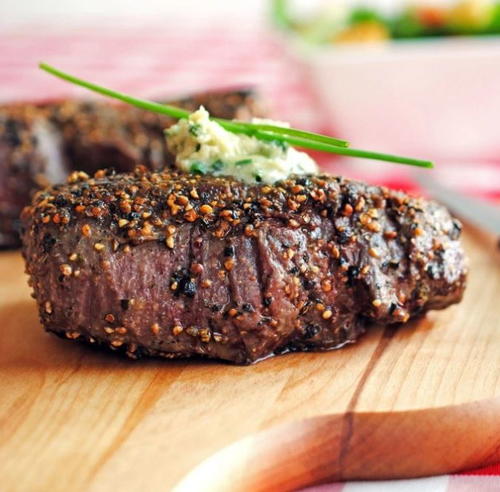 Pepper-Crusted Filet Mignon, best steak ever. So tender, no need for a knife. Love It!