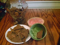 - Spread the mixture on dehydrator sheets covered with parchment paper. Score into desired shapes and dehydrate at 104 degrees F for 24 hours until nice and crispy.